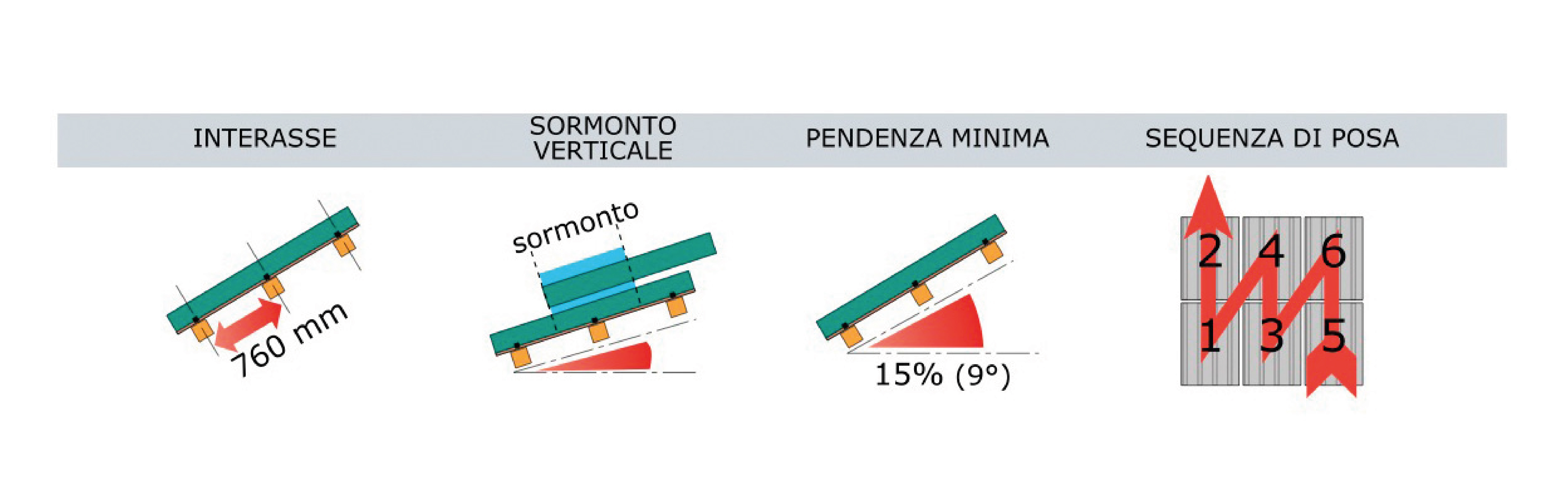 ● The upper ridge allows the connection between two opposing pitches of the roof, the diagonal ridge allows the connection between the different lateral pitches with the final finishing of the ridge terminal, and, if necessary, the three-way ridge