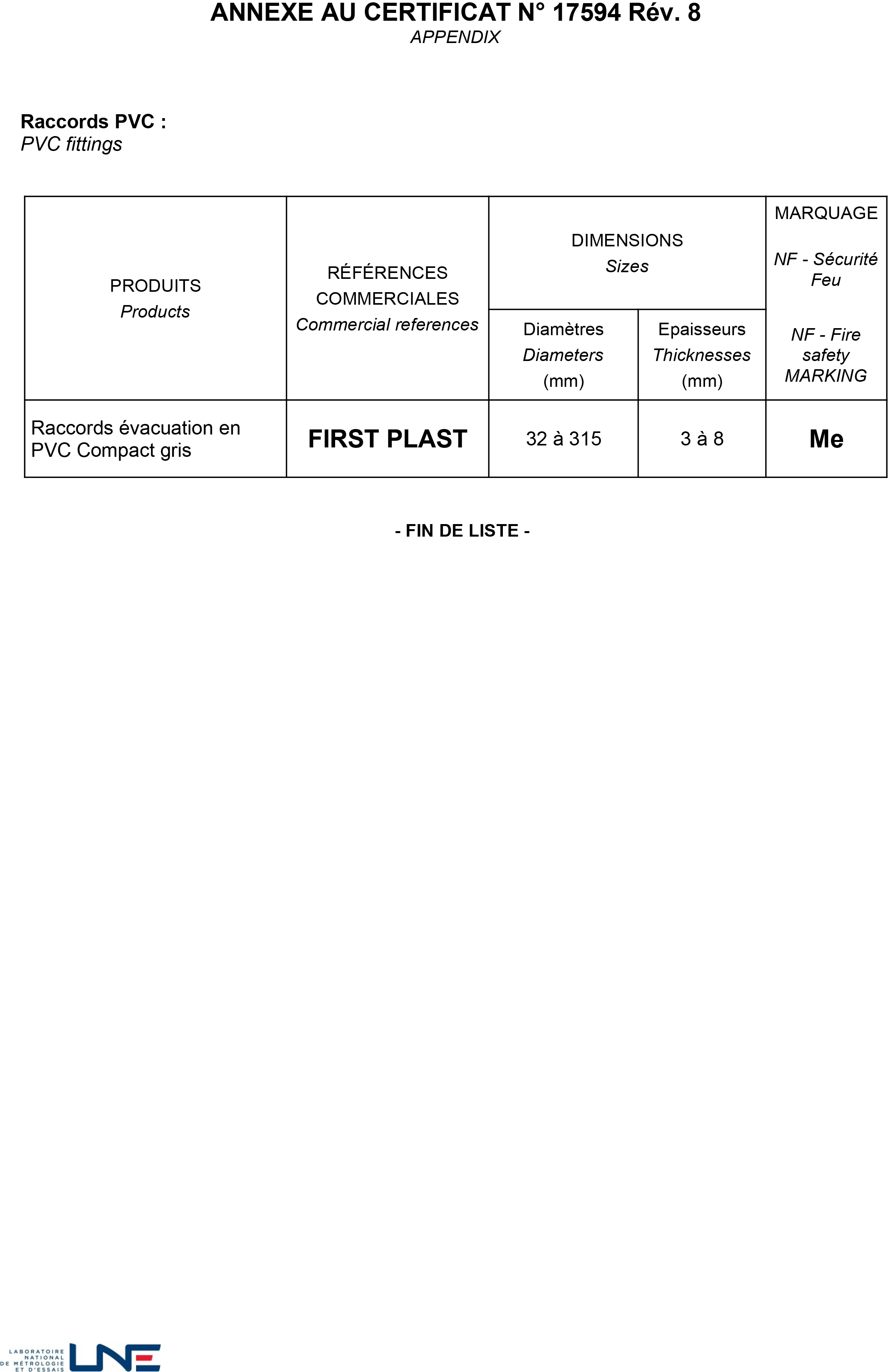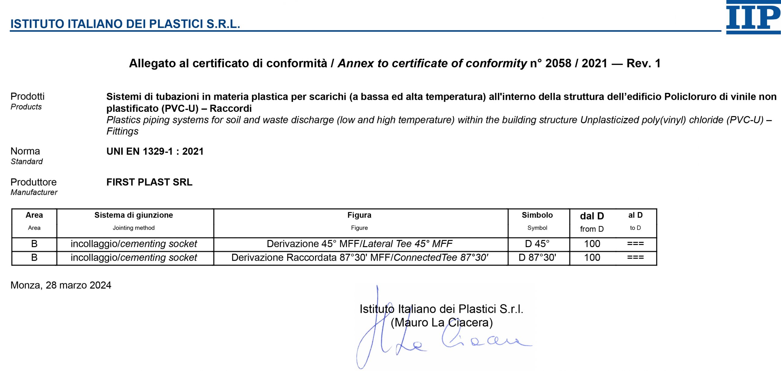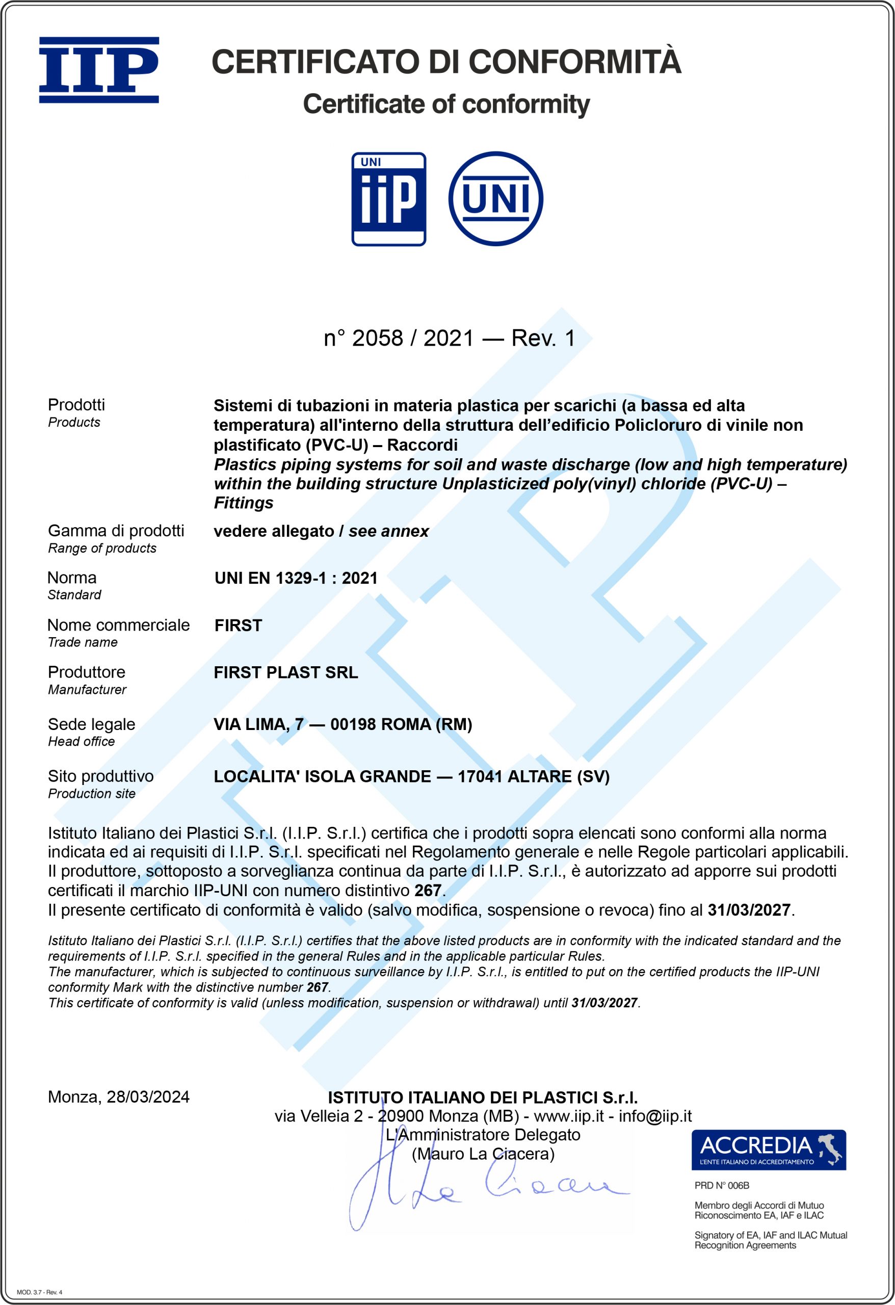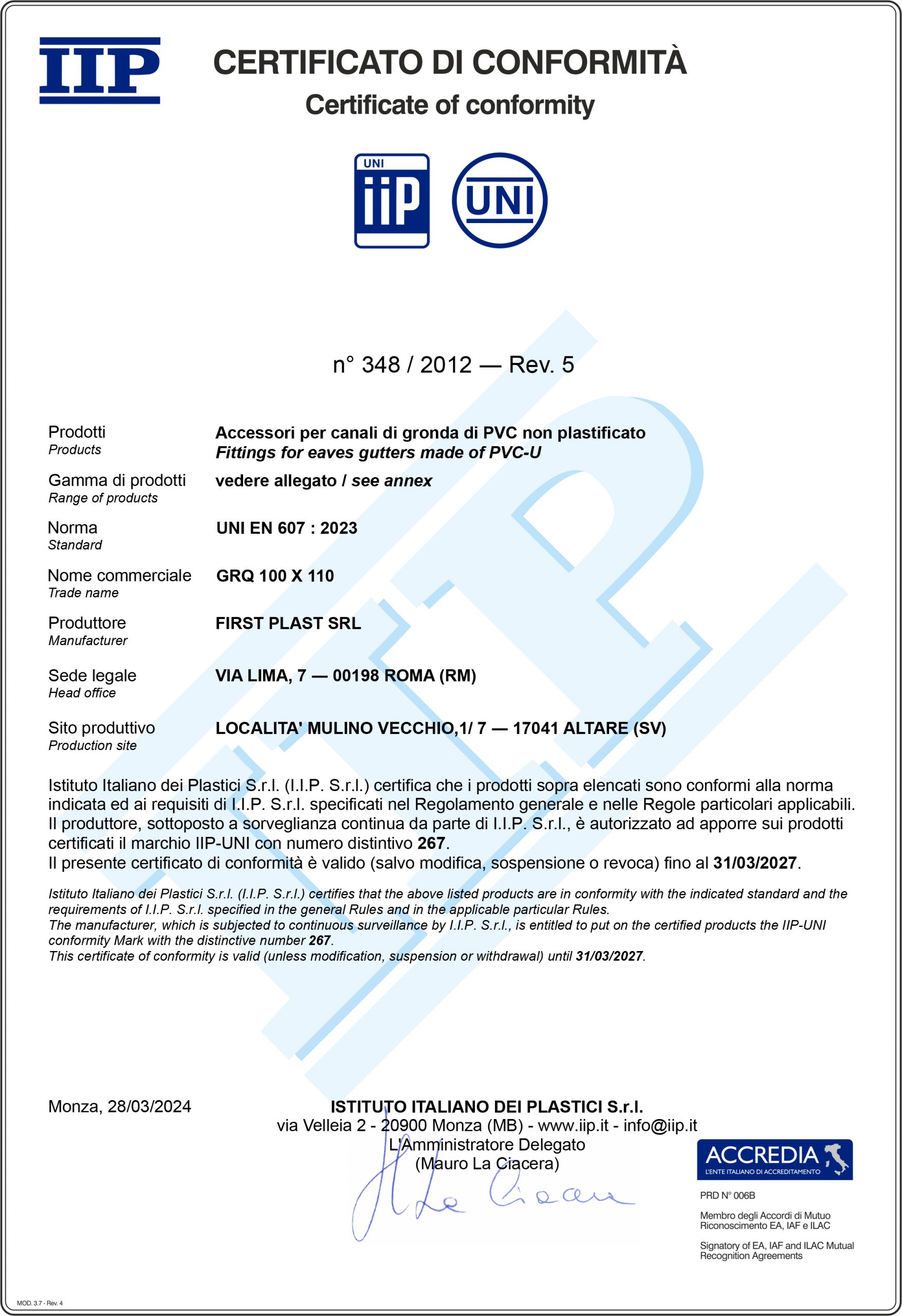 La certificazione di conformità alla norma UNI EN 607:2005 specifica che il prodotto soddisfa i requisiti richiesti per canali di gronda in PVC e dei relativi accessori, destinati ad essere utilizzati per l'evacuazione dell'acqua piovana. Gli accessori in PVC devono risultare sempre compatibili con forma e dimensione del profilo del canale e possono essere marchiati IIP UNI solo dopo aver superato i test previsti dai metodi di prova della norma. I modelli di accessori per gronda First Plast certificati a norma UNI EN 607:2005 sono quelli previsti per i profili 116, 125, 133 e il 100x110.