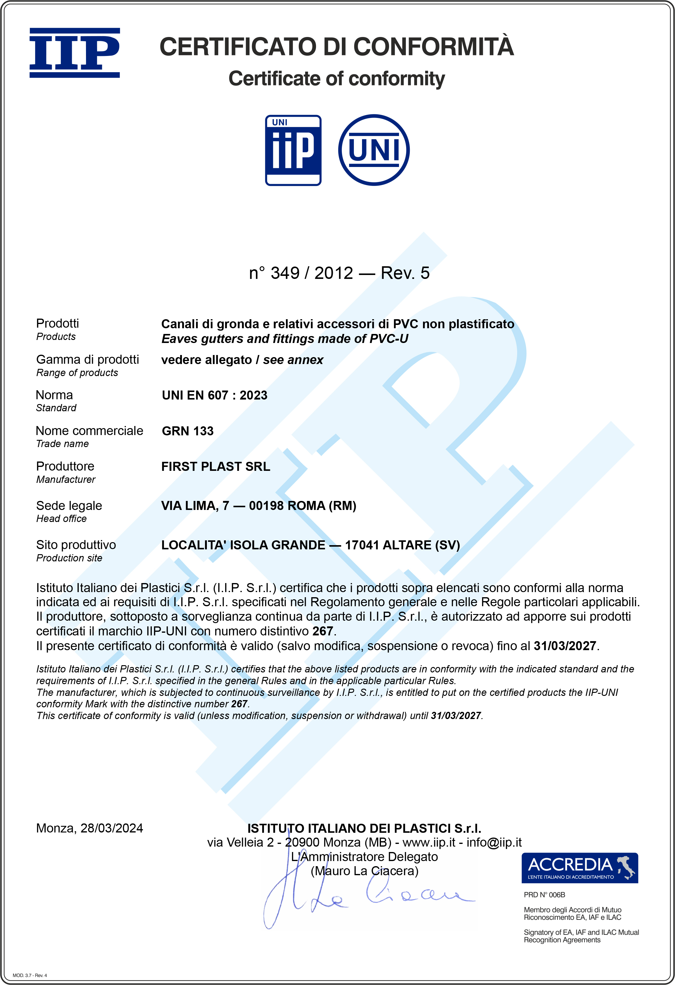 La certificazione di conformità alla norma UNI EN 607:2005 specifica che il prodotto soddisfa i requisiti richiesti per canali di gronda in PVC e dei relativi accessori, destinati ad essere utilizzati per l'evacuazione dell'acqua piovana. I canali di gronda possono essere marchiati IIP UNI solo dopo aver superato i test previsti dai metodi di prova della norma. I modelli di profilo di gronda First Plast certificati a norma UNI EN 607:2005 sono il 116, 125, 133 e il 100x110.