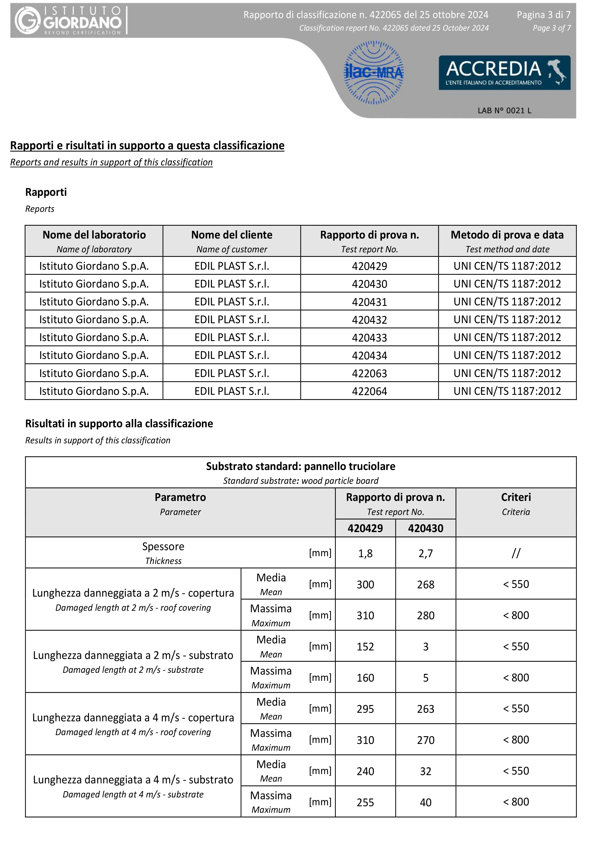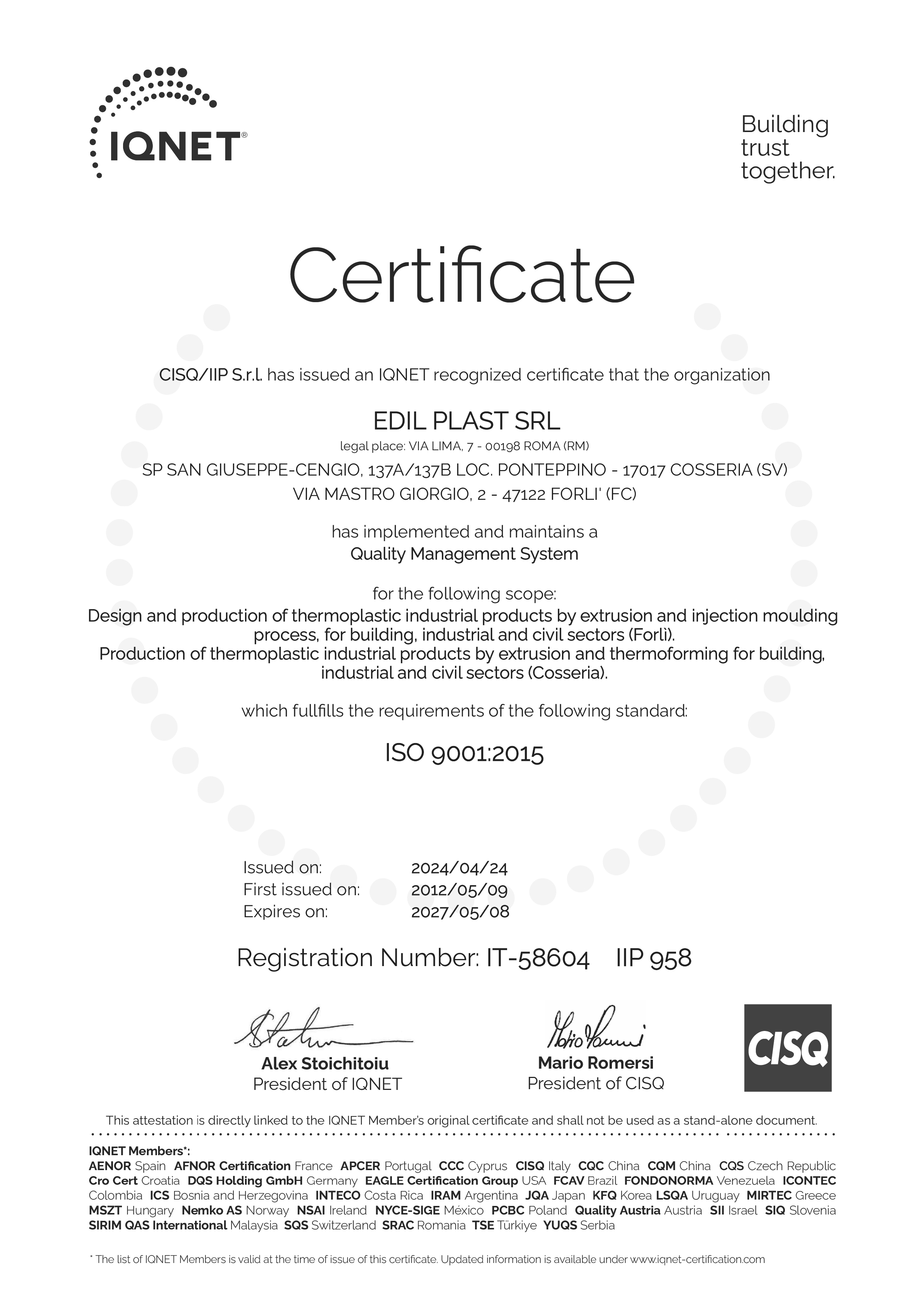 La certificazione UNI EN ISO 9001:2015, acquisita da Edil Plast a partire dal 2012, costituisce un ulteriore impulso, attraverso il nuovo Sistema di Gestione, per lo sviluppo delle politiche di qualità aziendali che regolano la produzione dei prodotti a marchio La Ventilazione e Cover-Life. I processi di progettazione e produzione delle unità operative Edil Plast dove vengono realizzate le griglie ed i sistemi di ventilazione (Forlì) e le lastre di copertura (Cosseria) sono conformi alla norma.
