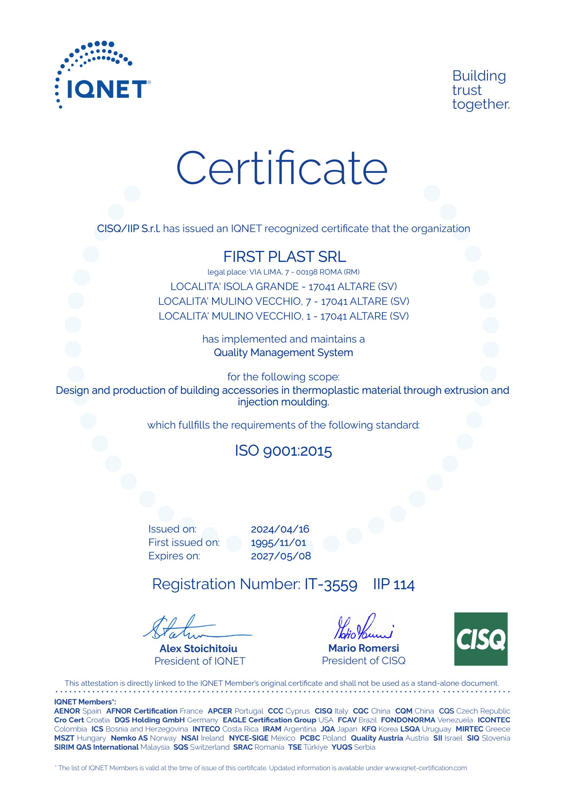 First Corporation distribuisce e promuove i prodotti e i marchi commerciali First Plast, La Ventilazione e Cover-Life: la progettazione e produzione di manufatti in materiale termoplastico per uso edile, civile ed industriale vengono presentate sotto un unico sistema di gestione qualità conforme alla UNI EN ISO 9001:2015 delle diverse unità operative delle aziende produttrici.