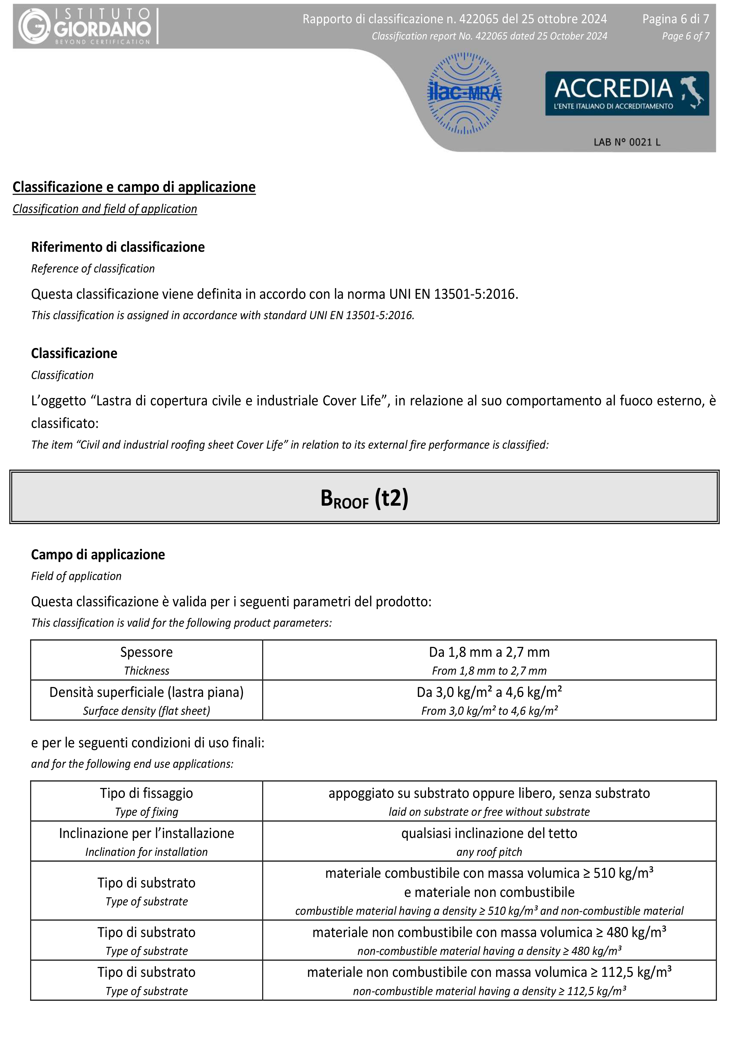 La certificazione B-ROOF (t2) riguarda la resistenza al fuoco delle coperture degli edifici. Questa classificazione è parte della normativa europea UNI EN 13501-5, che valuta le prestazioni delle coperture in caso di incendio esterno. La classificazione B-ROOF (t2) indica che il prodotto ha superato specifici test di resistenza al fuoco e può essere utilizzato su diversi tipi di superfici, sia combustibili che incombustibili. Questo tipo di certificazione è particolarmente importante per garantire la sicurezza antincendio, soprattutto in edifici con installazioni fotovoltaiche.